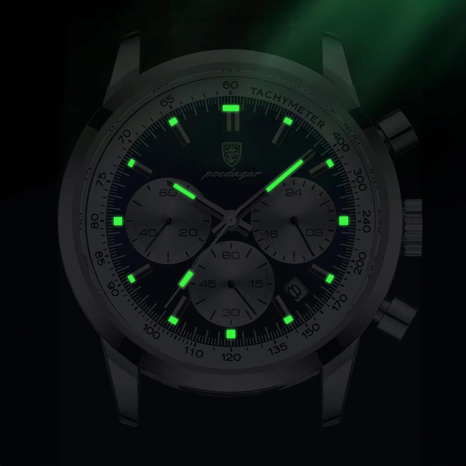 Criado para medir as horas com precisão, o Poedagar 911 possui indicador de segundos e calendário. Além disso, apresenta resistência à água para até 30 metros de profundidade, sendo fabricado em aço inoxidável, conhecido por sua resistência à corrosão e confiabilidade.