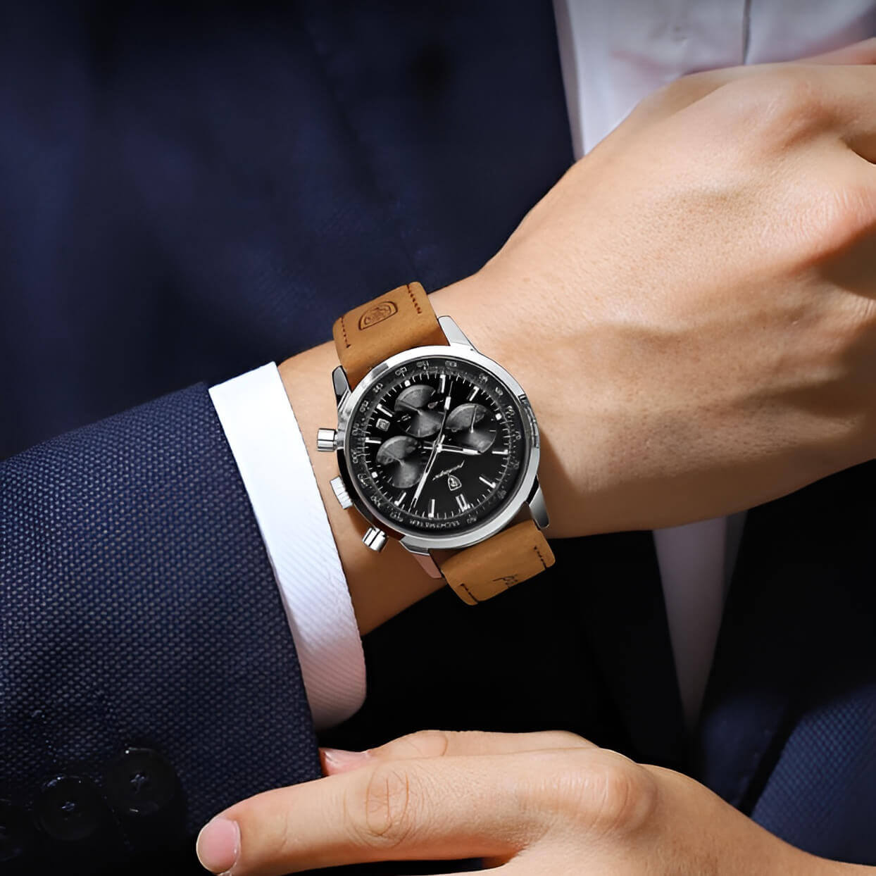 O acabamento luxuoso em couro legítimo e o design suíço atemporal o tornam a escolha ideal para eventos sociais ou casuais. Você fica sempre elegante!